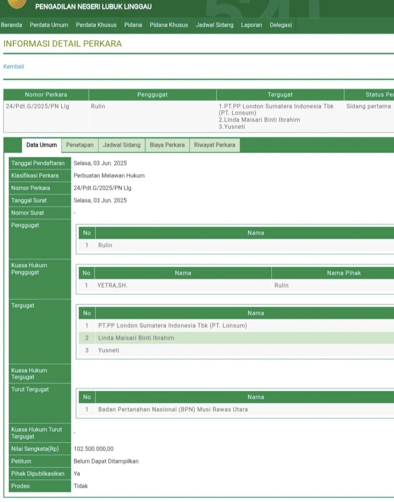 Seorang warga Beringin Makmur II yang berprofesi sebagai Buruh Tani mengajukan Gugatan Perdata terhadap PT. LONDON SUMATRA INDONESIA, Tbk di Pengadilan Negeri Lubuklinggau.