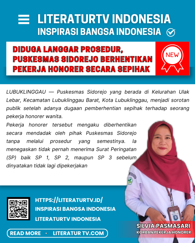 LUBUKLINGGAU — Puskesmas Sidorejo yang berada di Kelurahan Ulak Lebar, Kecamatan Lubuklinggau Barat, Kota Lubuklinggau, menjadi sorotan publik setelah adanya dugaan pemberhentian sepihak terhadap seorang pekerja honorer wanita.
