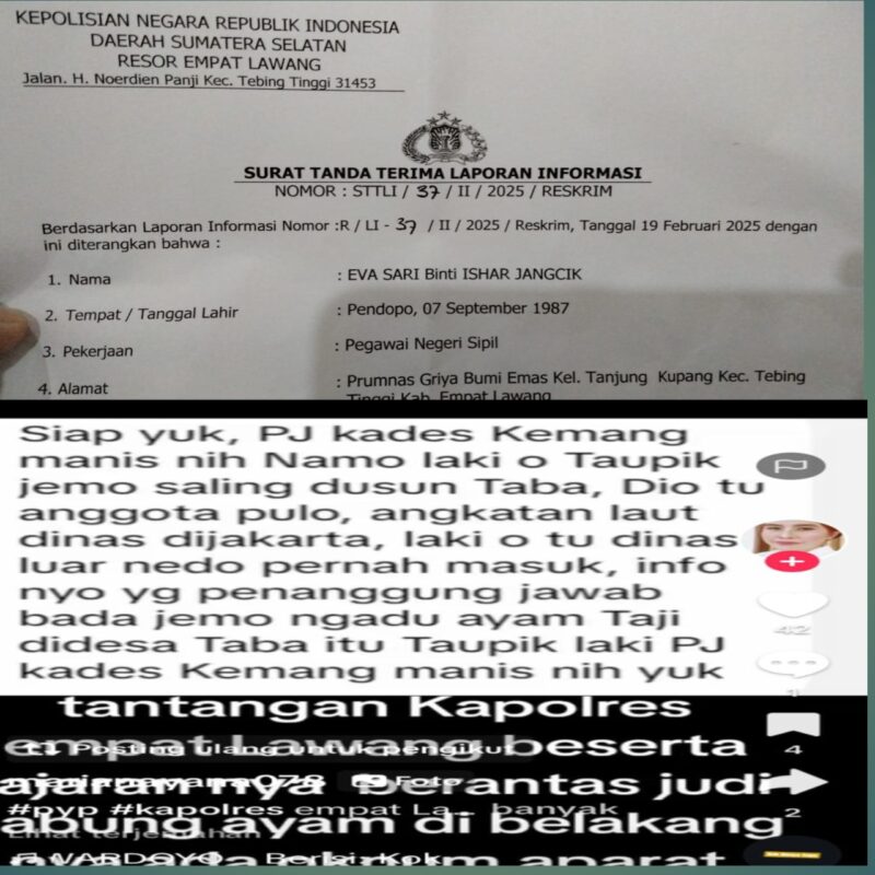 Empat Lawang , literaturTv.id,.|| EVA PJ Kemang manis kecamatan Tebing Tinggi atas Nama EVA SARI Pada hari Rabu,19 ,februari,2025 Resmi laporkan akun tik tok Mariana ke polres Empat Lawang terkait dugaan pecemaran nama baik melalui sosial media,