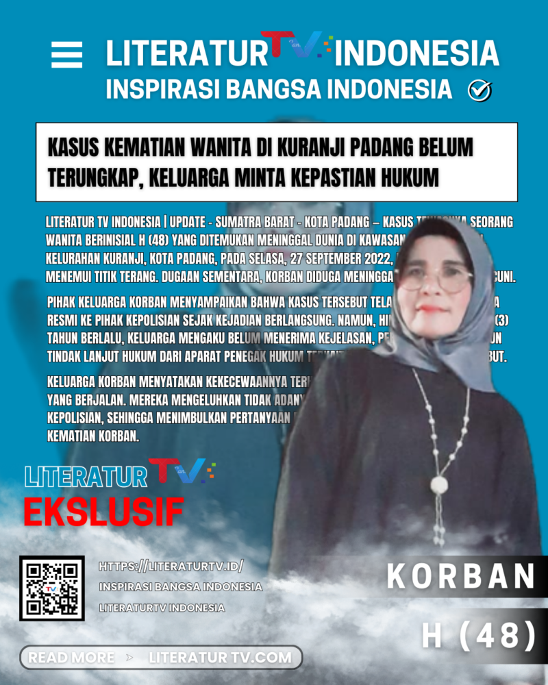 LITERATUR TV INDONESIA | UPDATE – SUMATRA BARAT – KOTA PADANG — Kasus tewasnya seorang wanita berinisial H (48) yang ditemukan meninggal dunia di kawasan Lapau Munggu, Kelurahan Kuranji, Kota Padang, pada Selasa, 27 September 2022, hingga kini belum menemui titik terang. Dugaan sementara, korban diduga meninggal dunia akibat diracuni.