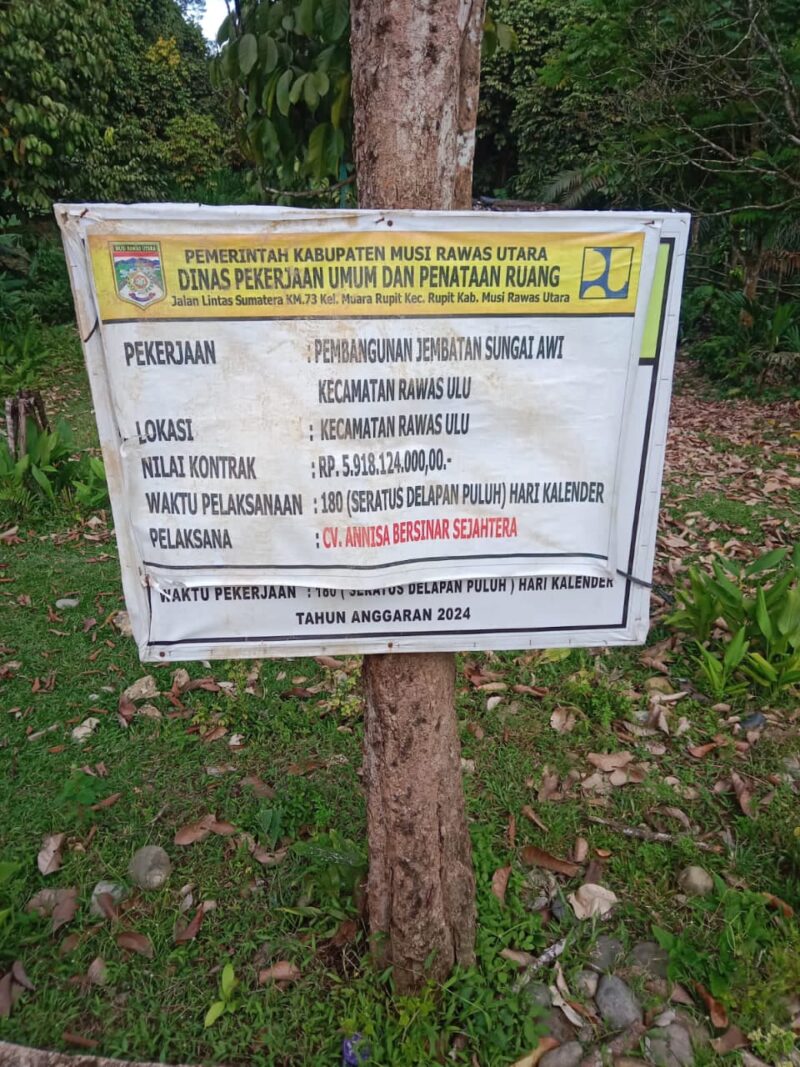Berdasarkan data LPSE Kabupaten Muratara, proyek pembangunan Jembatan Sungai Awi senilai Rp5.918.124.447,52 ditenderkan pada 2024 dan diselesaikan akhir tahun lalu. Beberapa waktu terakhir, muncul sorotan terkait kualitas pekerjaan dan kondisi terkini jembatan tersebut.